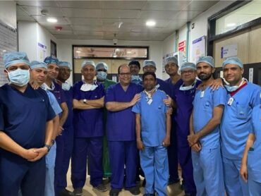 Photograph of the team after the MitraClip procedure Repairing the mitral valve in severe mitral regurgitation (MR) by a Clip placed in the middle of the mitral valve via a catheter from the leg...